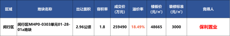 11月17日,上海第七批次土拍首日,保利置业以约25.95亿元竞得闵行区MHP0-0303单元01-28-01a地块,溢价率约18.49%, 折合楼板价48665元/㎡,地块装标不低于3000元/㎡。