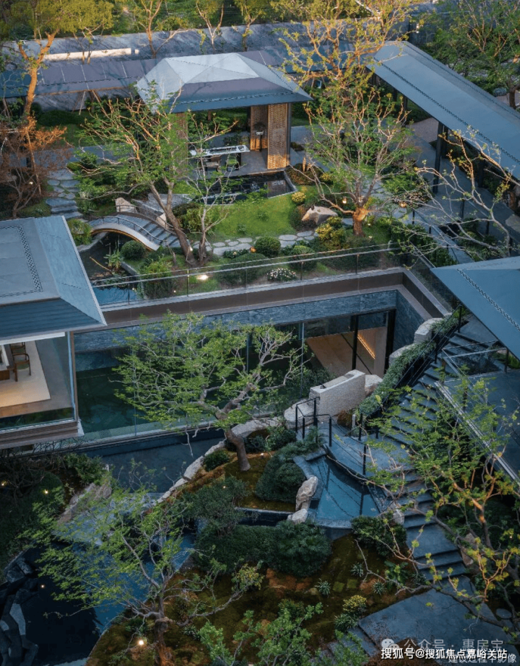 而最令人惊艳的,当属约6米地势差打造的下沉式山水庭院,山、石、水、林有序交织,犹如一幅“豁然开朗山水轴卷,每一步皆是景致,每一处皆有不同。