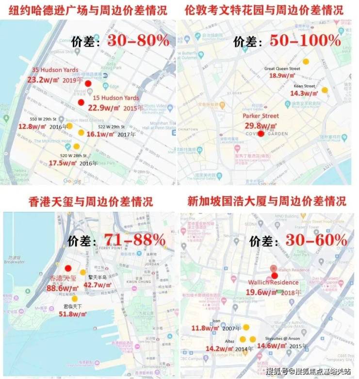 我们来看几个享誉全球的成功案例,纽约哈德逊广场,伦敦考文特花园,新加坡国浩大厦,香港天玺,这些顶级公寓都有一些共性点: