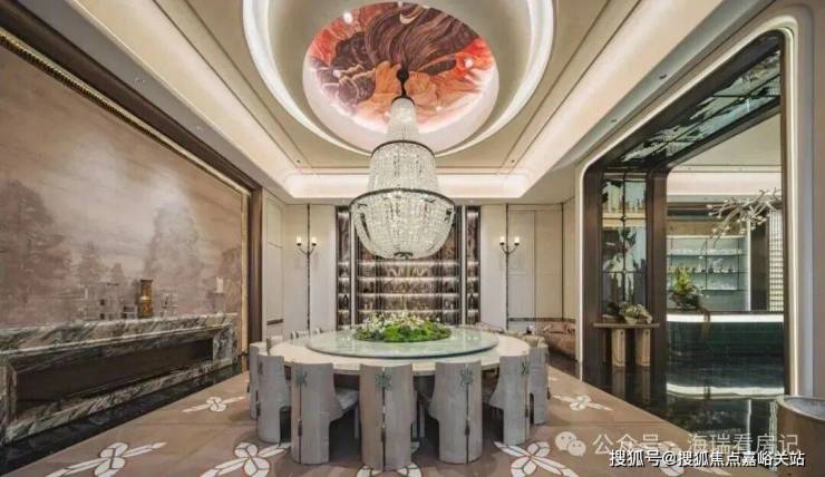 首先是奢石含量极高,从入户处的玲珑玉拼花与透光云石辉映,到翡翠绿奢石墙景、再到 发光云石装饰点亮归家路,石材的典雅贯穿始终。