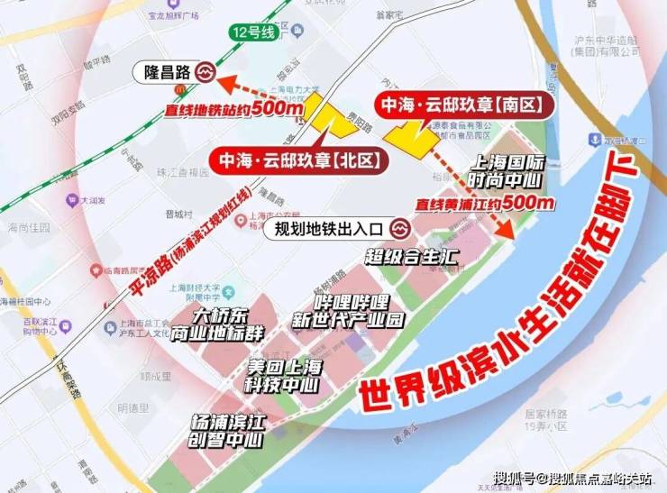 轨道交通方面:距离地铁12号线隆昌路站直线约500米,步行可达,这在杨浦滨江一众不靠轨交的项目中是非常难得的。进站后4站可达北外滩,7站陆家嘴,8站通达人广。