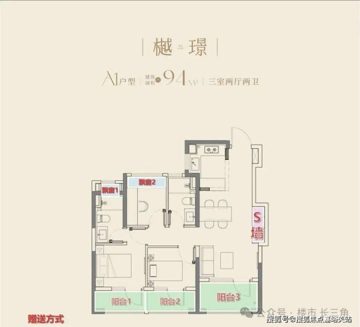 约94㎡起步户型:设计了市场上不多见的南向三阳台,凭借充足(约9%)的赠送面积,实现空间利用率最大化。