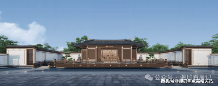 项目采用三段式入户:一进辋川入画(主入口空间),二进:闲庭碎影(戏台庭院),三进:临风听湖(自然庭院)。入户大门屋顶采用唐代“重檐歇山顶”形式配上台基上的唐代建筑标志阑干,入院后有一副唐风画作,其次以亭台楼榭、理水叠山的中国园林意境,重现盛唐大明宫百花争艳,小桥流水,落叶如金的景观。社区景观层层递进,让住户置身其中,体验唐风山水。