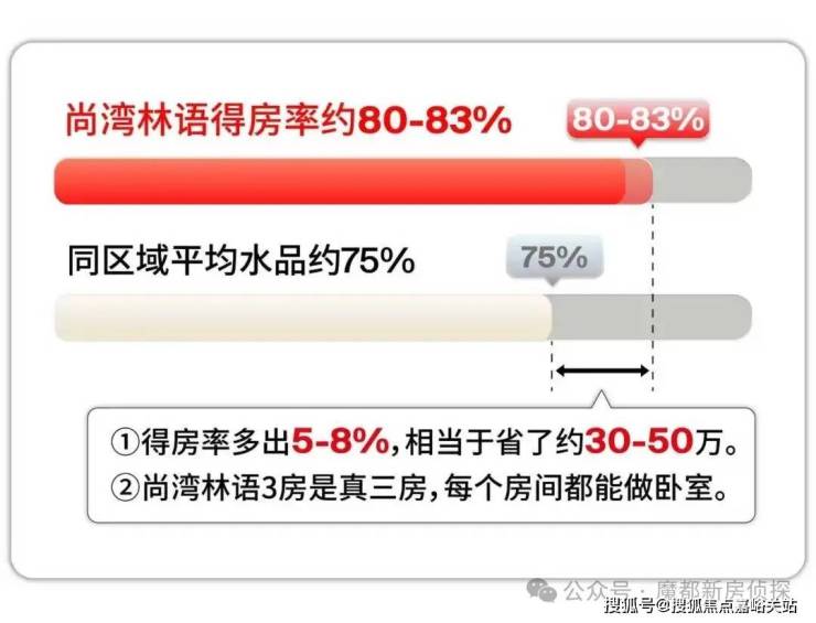 区域内新房得房率平均约75%,以尚湾林语百平米约81%得房率算,比同区域项目多赚6㎡!相当于一间书房;要是换算成房款,直接省下30-40万!相当于花同样的钱,买更大的空间,性价比直接拉到顶!