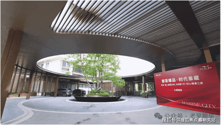 华发·海上都荟的 主入口做了环岛式酒店大堂设计,风雨回廊在天气炎热或者下雨天时让人更舒适,融合了酒店的精致感、艺术感,给人仪式感的入户体验。
