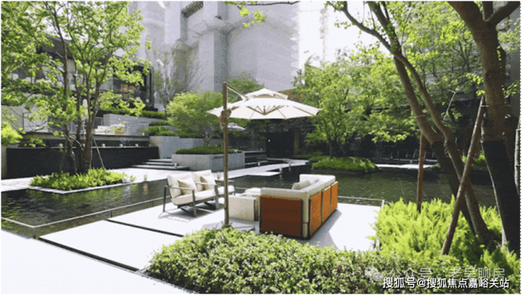 走进来,便是满眼绿意的 下沉式景观庭院,拾级而上,两侧景观在阳光的照耀下呈现出非凡的光影,还有潺潺流水相伴,带来度假式的沉浸体验。