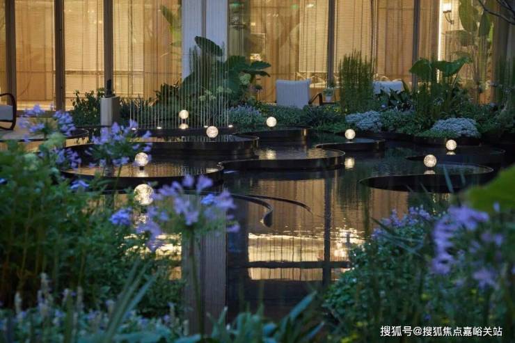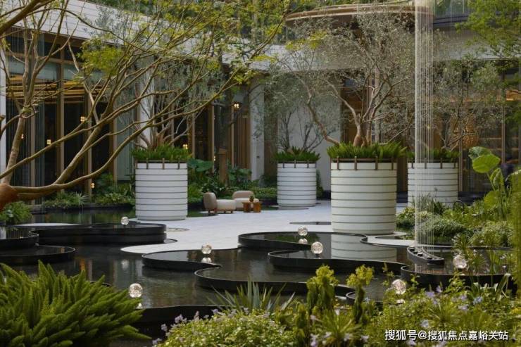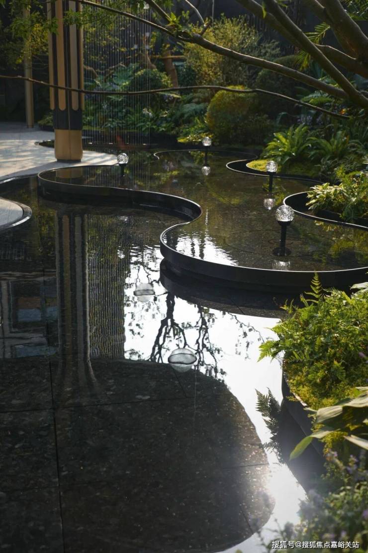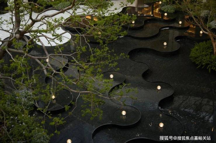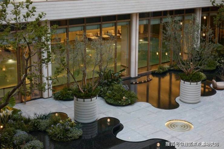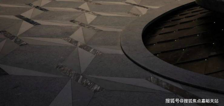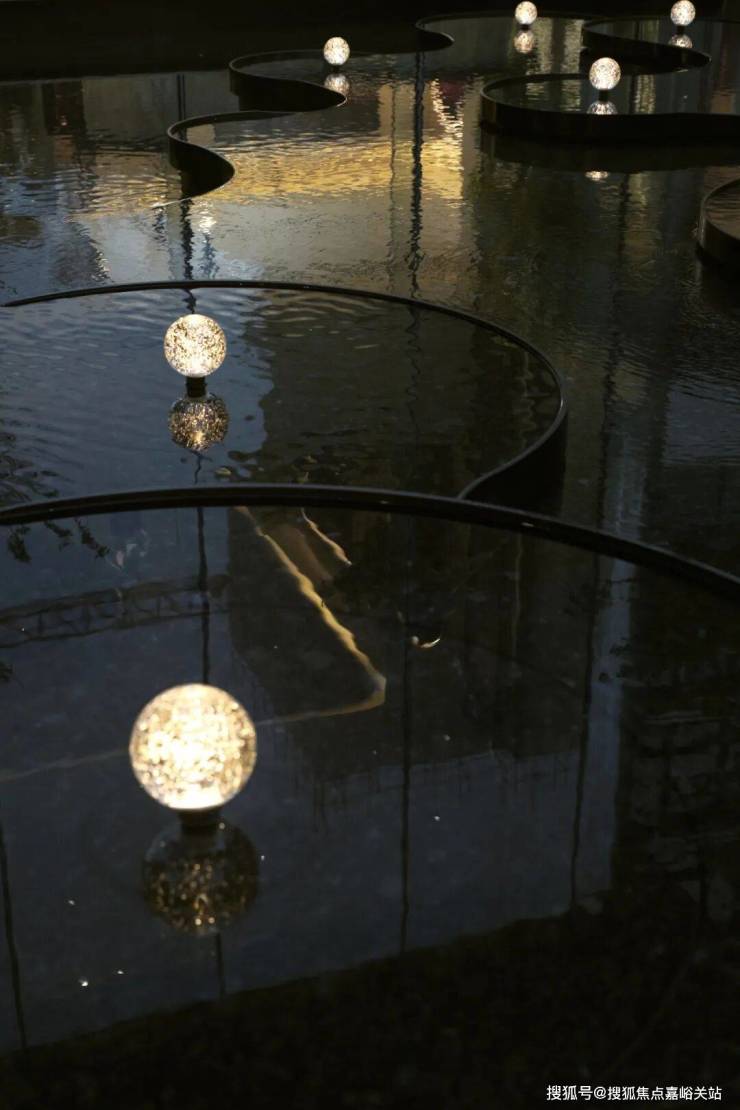 “艺术定制水盘”静卧于场地中央。威尼斯棕与云石板材交错铺陈,沉稳且灵动。菱纹水面捕捉光的轨迹,如星光流转,在昼夜交替间折射出内敛而璀璨的光芒。