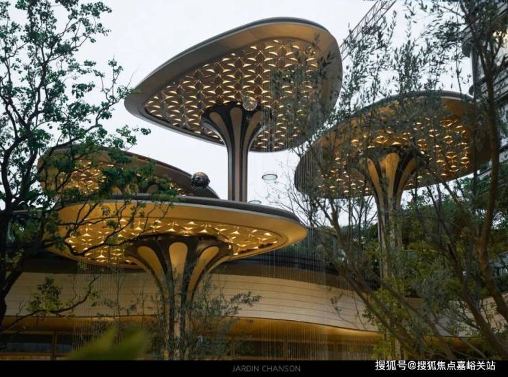 树状生机装置漂浮于都市之上,以层叠的视觉处理模拟向上生长的呼吸节奏,纯粹的流动光泽与自然意象交织,使结构既具理性的稳固,也蕴含柔性的诗意。