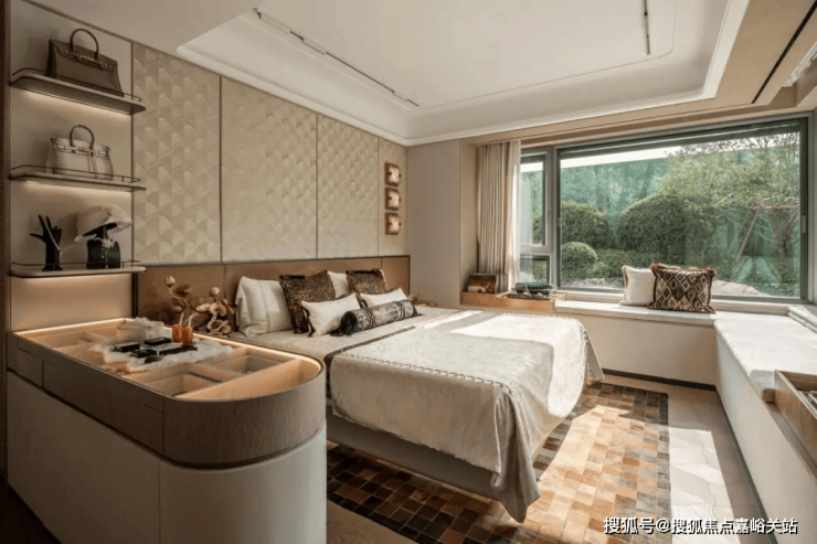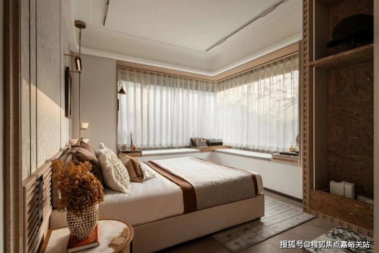 270°无柱飘窗 的主卧套设计,打造出一座"空中观景舱",将晨昏光影、四季流转尽数收纳。