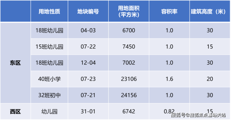 东区和西区最大的不同在于教育和公建设施配套,东区人口更密集,有5幅教育用地,从幼儿园至初中;而西区仅有1幅教育用地,作为幼儿园。