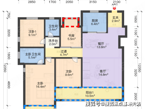 经典 “飞机户型”,三开间朝南,面宽约 10.2 米。U 型厨房、双卫设计、主卧套房带飘窗。空间紧凑无浪费,功能性拉满,总价约 365-410 万。