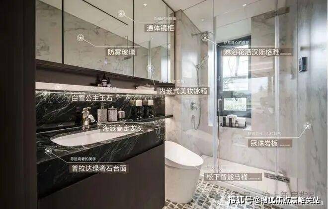 卫生间臻选普拉达绿奢石台面,雍容华贵。同时臻选海派美学金属镜柜搭配防雾玻璃,嵌入美妆冰箱,细节到位。