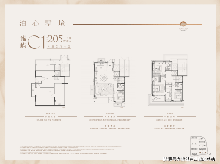 户型特点: 下叠边套,南向面宽约9米,客餐厅同宽约5.8米,空间开阔。一楼设南向卧室,采光好且视野佳。二楼为三套房+主卧总统套房设计,主卫南向,可容纳浴缸和双台盆。地下室方正,附赠采光井,利用率高。