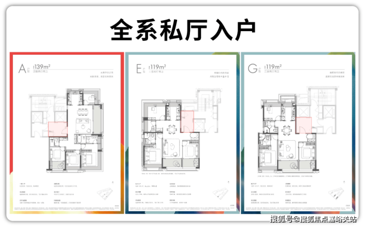 项目打破“类一梯一户仅属于150㎡以上大户型”的行业惯例, 所有119-139㎡户型均标配私厅入户 ,让每位业主都能享受平等的入户仪式感。