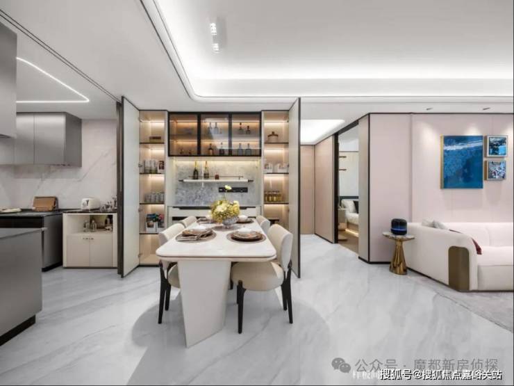 超30㎡餐客方厅采用一体化布局,巧妙地连接南向阳台、U型厨房,形成极佳通风采光通道。轻松容纳6人餐桌,无论是三代同堂的日常用餐,还是周末的家庭聚会,都能从容应对。