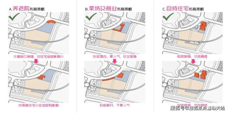 首先锁定北侧公区区域,探索养老院、菜场、商业及自持住宅的布局策略。