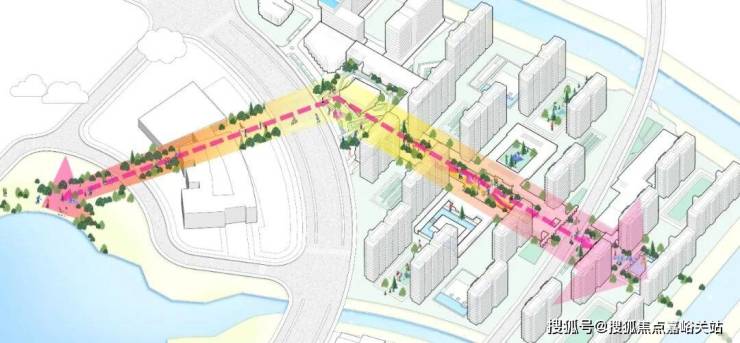开放共享轴链接各个节点:生态运动休闲带,生态林荫大道,街区绿地;形成连续的绿色公共、半公共空间。并在绿地中注入国际文化特点的商业配套,形成尺度宜人的街道和建筑尺度。