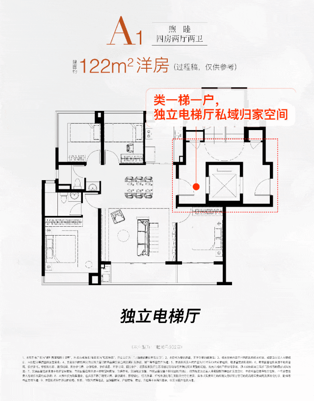 建面约122m²4房2厅2卫墅境洋房,类1梯1户设计,精装交付,南北通透。