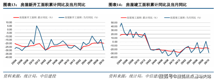 统计局公布2025年10月房地产市场运行情况,10月单月房地产销售面积、投资额、新开工面积、竣工面积分别为6147万平方米、5857亿元、3662万平方米、3732万平方米,同比增速分别为-18.8%、-23.0%、-29.5%、-28.2%,前值分别为-10.5%、-21.3%、-14.4%、+1.5%。