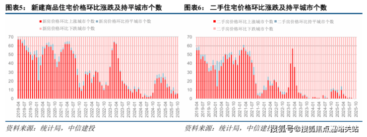 政策支持下销售动能有所减弱。10月单月全国商品房销售面积同比下降18.8%,降幅较9月扩大8.3个百分点;较2023年10月下降20.9%。房价表现延续弱势,10月单月全国70个大中城市二手住宅价格指数环比下降0.7%,降幅较9月扩大0.1个百分点,9月、10月连续两个月份70个大中城市的二手住宅价格均出现环比下跌;10月70个大中城市中有6个城市的新建住宅价格出现环比上涨,上涨的城市数量仍偏少。