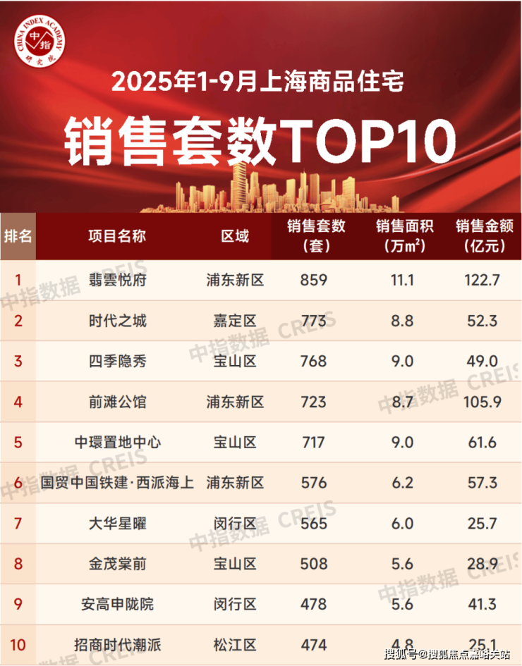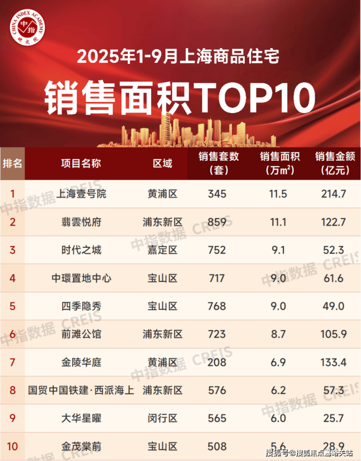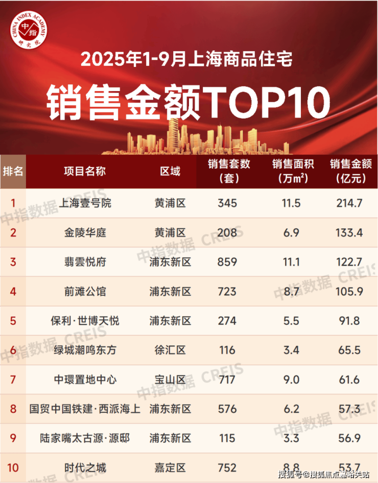 特别声明:房地产企业销售数据、项目销售数据、商品住宅市场数据统计均是以2025年1月1日-9月28日期间商品房合同销售额为统计口径,主要依据中指数据CREIS(点击查看)在上海的销售监数据;对于少数未在监测范围内的项目,由企业提供相关证明文件,经课题组对数据进行严格审核,纳入统计范围。本报告仅供参考,课题组不对使用报告及其内容所引发的任何直接或间接损失承担责任。