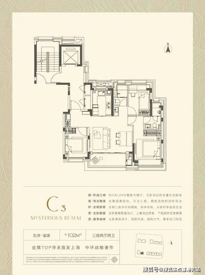 建面约102㎡三房:板块稀缺的“百平王牌”:随着上海“7090”政策取消,未来百平三房供应将大幅收紧,这款户型堪称桃浦板块的“稀缺资产”。其最大亮点是3.5开间朝南+约5米面宽LDKB超大横厅,配合全卧瞰景飘窗设计和独立电梯厅,实用面积极高-1-3。层高达到3.1米,远超常规2.9米,空间感跃升-3。