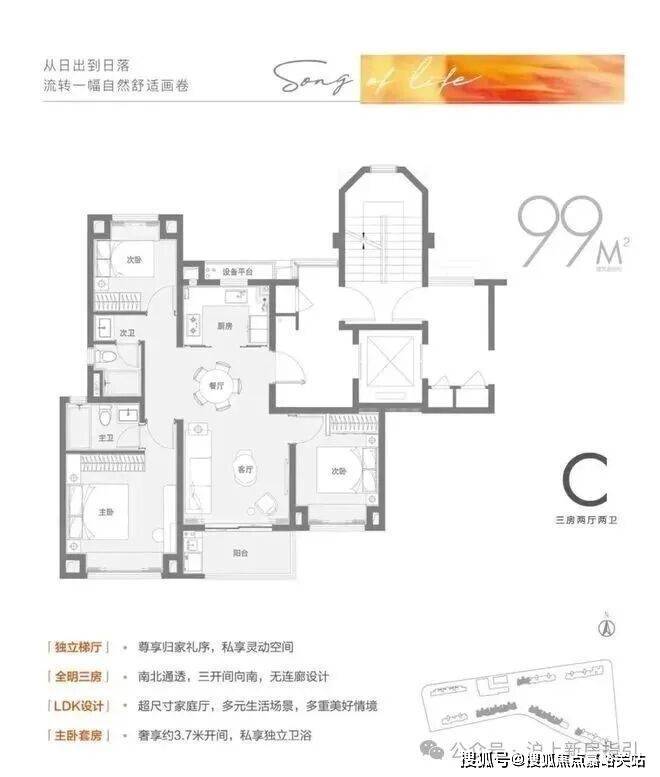 建面约99㎡3房2卫户型不仅保留三开间朝南和餐客厅一体化的优势,更在尺度上大踏步进阶。