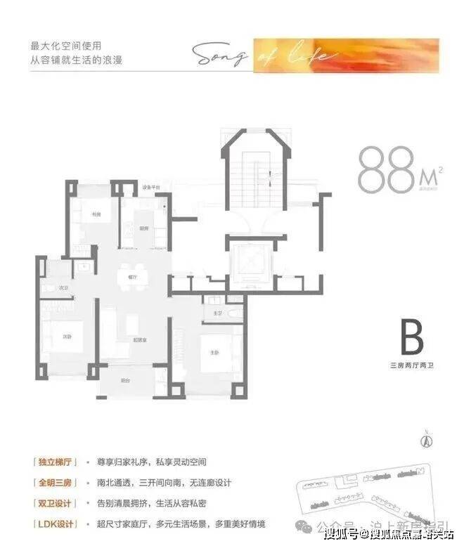 相较于市面上普遍的建面约88㎡只能做3房1卫的设计,该户型竟做到惊人的3房2卫!