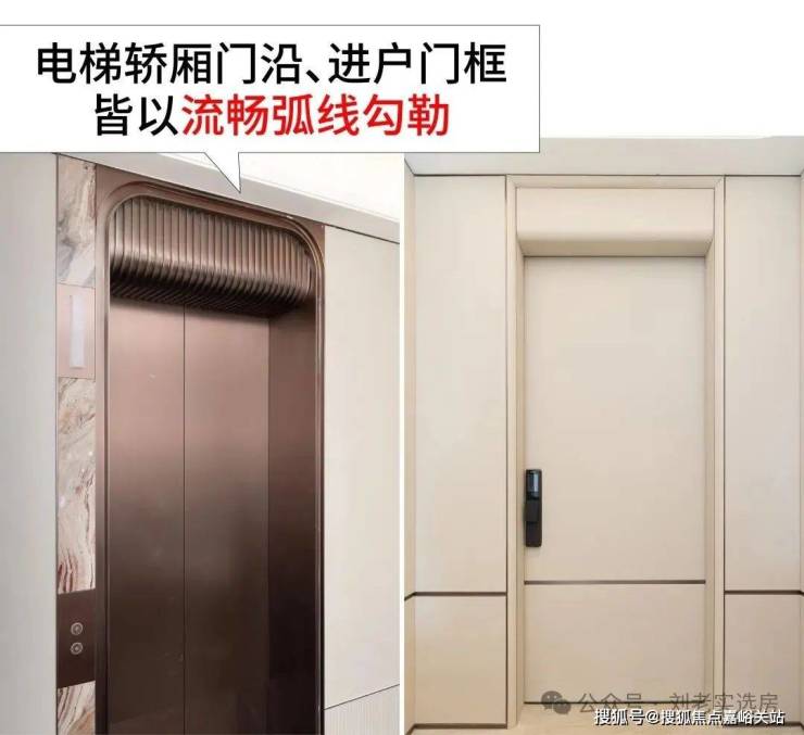 电梯轿厢门沿、进户门框皆以流畅 弧线勾勒,为业主日常等电梯和归家增添几分优雅。