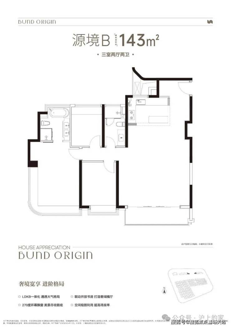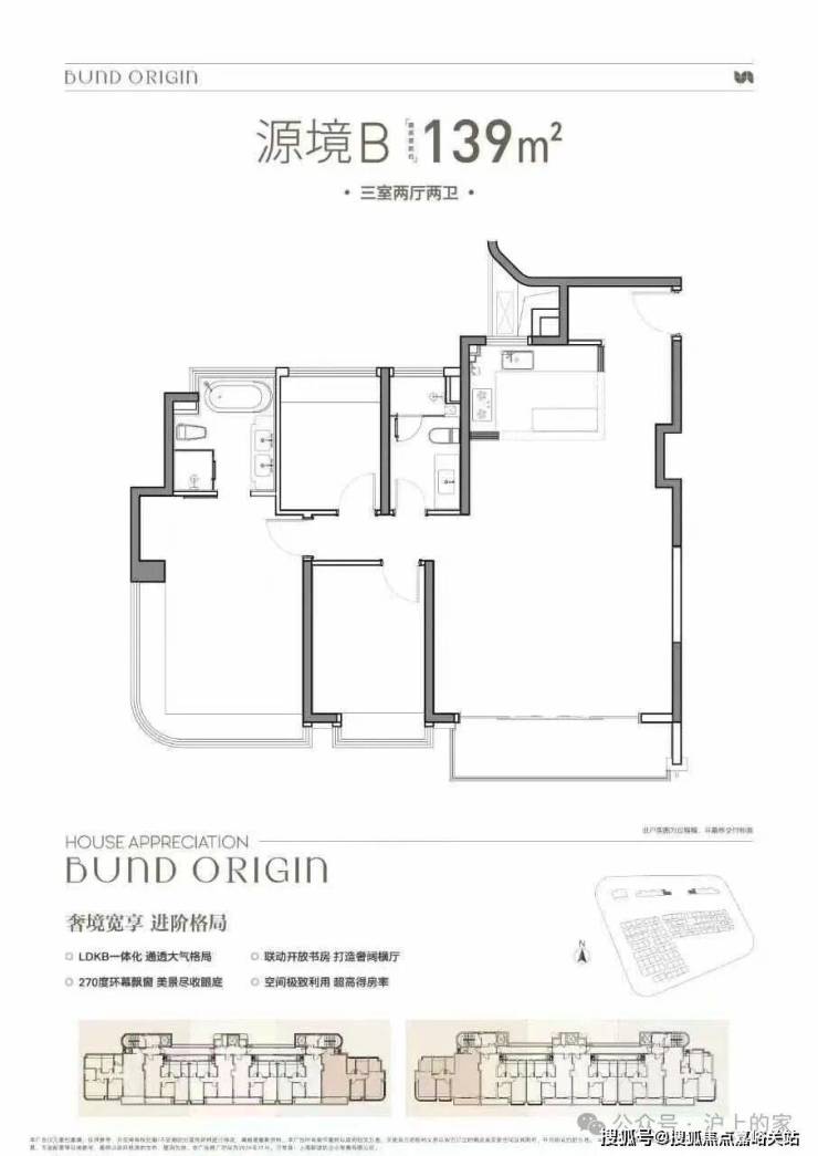 B户型是3房2厅2卫格局,上海中建壹品外滩源著官方售楼处电话:400-118-5086√√√【已认证】三开间朝南+LDKB一体化+奢阔宽厅+全卧室带飘窗+主卧套房设计+动静分离+主卧270度飘窗,舒适度更高。