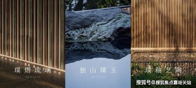 入口景墙的「璞熠琉璃」是以中国五大名器之首的琉璃打造,千度烈焰淬炼、数十道手工打磨,琉璃随四时光影流转,晨光如霞、暮色似金,内部天然气泡造就每一片光影的独一无二,极低成品率与无法复制的艺术性,成为璞元的独特标识。