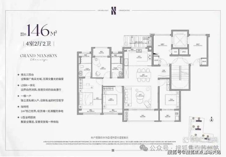 建面约143㎡的4房户型,类一梯一户的设计,每一户都有一个面积约8㎡的独立采光电梯厅空间;四开间朝南+大宽厅,采光效果爆棚;通过LDKB一体化设计,形成一个近50㎡的客餐厅空间,极大提升空间场景的可能性;卧室也采用了酒店化套房设计,主卧贯穿南北套房设计,南北皆有飘窗。