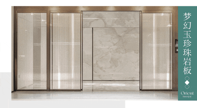 地下归家大堂用材选取 意大利进口岩板,色泽温润,和谐统一。 人脸识别自动移门便捷实用, 金属夹丝玻璃美观大气,开阖家的尊崇与安心。