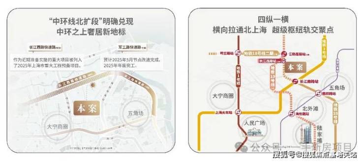 地铁18号线二期(在建)将原本不完全相连相交的地铁1号线、3号线、19号线(在建)横向拉通,北上海轨交因此互联,淞南将成为区域轨交的聚点;同时,本案近邻长江西路地铁站(直线距离约150米),咫尺杨浦背靠江湾,畅达淞南小五角场,1站江杨南路、5站复旦大学、7站五角场,便捷通联。