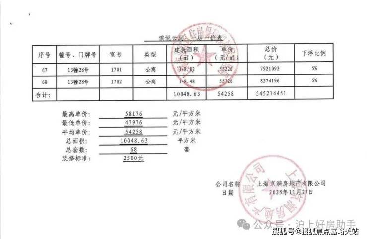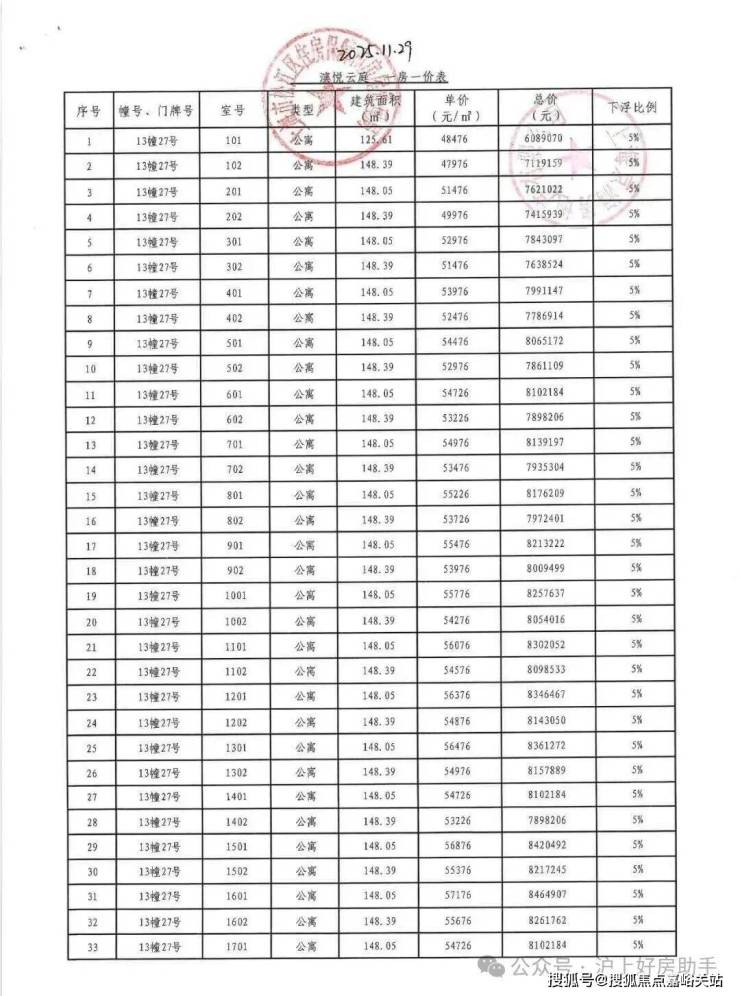 中国铁建·西派云间一房一价表: