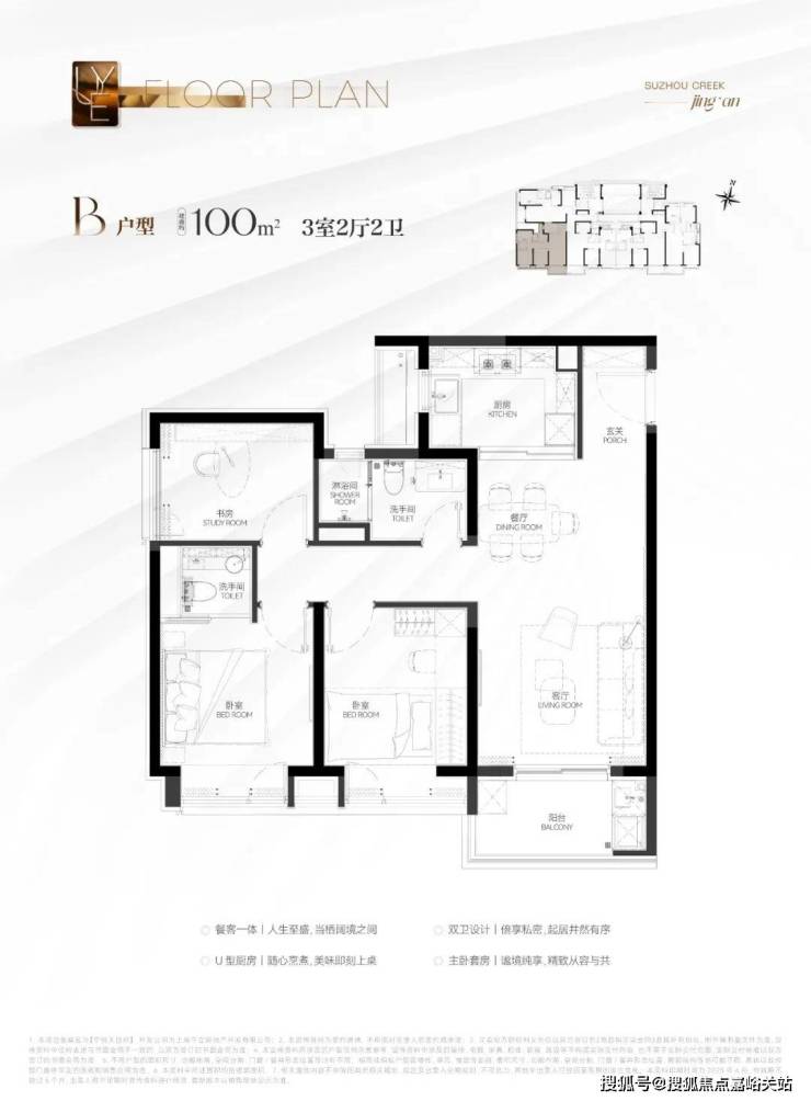建筑面积约100㎡3房 B&C 户型:3房功能性符合市场主流需求,三开间朝南的布局保证充足光照。动静分离的设计让安静与活力同在。主卧套房设计,舒适度和私密性双爆表!