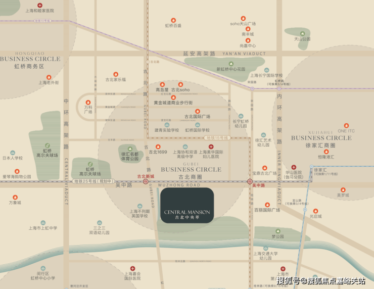 轨交方面: 「古北中央萃」是准双轨交的地铁房,现有的是直线距离约700米的最美地铁站之一的15号线吴中路站,未来还会有25号线的古北新城站,站点位置就设在「古北中央萃」西侧不远处。