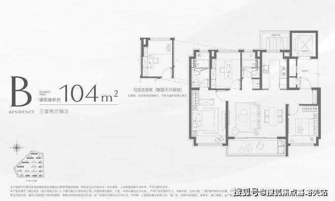 104㎡的户型,采用了大横厅 +270°转角窗设计,南向阔景阳台面宽约5.3米,这样的尺度,在100平出头的面积段极其罕见。另一个南向客卧不管是当成老人房还是客房,都与另外两房做了物理分割,保证了最大程度的舒适度和私密性。