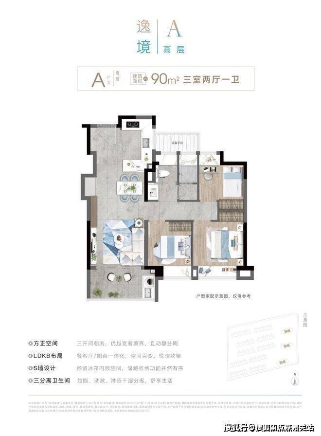 建面约100㎡3房:三开间朝南+南北通透+双卫设计,充分满足刚需置业两代人的生活需求!LDKB一体化设计,为家庭交互提供全新场景,将空间更大化利用!