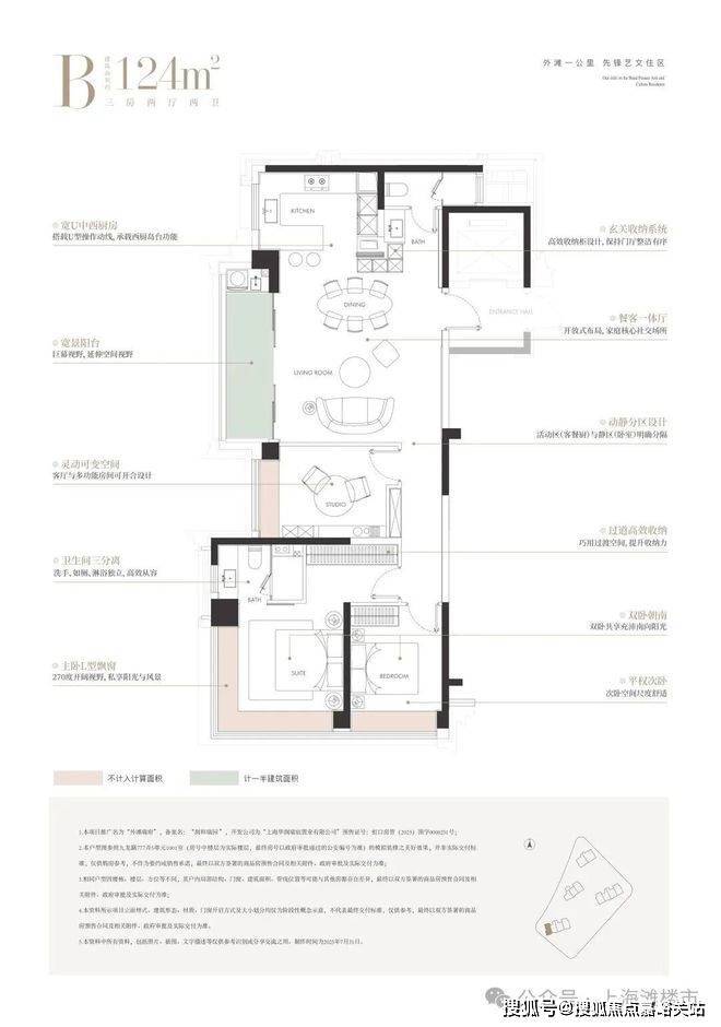 建面约124㎡的边厅“全景舱”户型,是外滩板块极致稀缺的臻品 。它以三房布局满足主流家庭需求,更以无遮挡的视野与巨幕般的边厅落地窗,将城市天际线化为私藏画卷。主卧270°L型飘窗,让阳光与风景成为生活的主角。