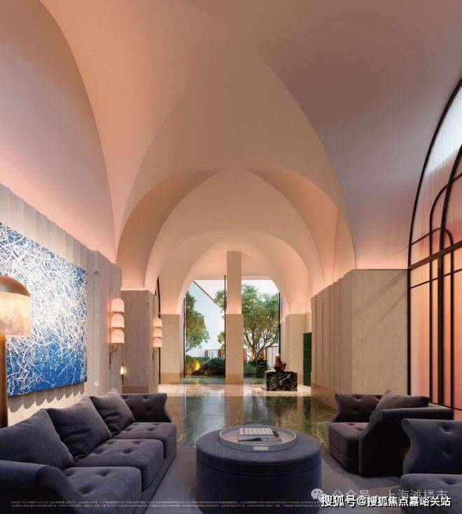 从九龙路起步,在繁花水岸的滨水步道上漫步归家 ;归家之路在滨水艺境另一侧,是 约7000㎡的沉浸式邻里风貌街区 ,融合党群服务与邻里综合体业态,可在归家路途中感受精致烟火气;之后抵达九龙路归家主入口的河岸艺术大堂,两条地上细分动线,藏着不同的归家意趣:一条从主入口艺术大堂步入,沿着风雨连廊穿越花园小径,光影透过叶片洒落脚边,风携花香漫过肩头,仿佛逛完一场印象艺术展;另一条则经 风雨连廊直抵“艺术品展列空间”泛会所,或许邂逅正在展出的私人藏品,在艺术氛围中完成圈层身份的过渡 。最后步入电梯厅,半圆弧形天花吊顶暗合“天圆地方” 东方哲学,让归家终拾恢弘而宁静的仪式感。