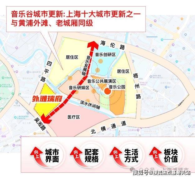 旁边还有上海首批十大城市更新单元——虹口嘉兴01单元。这个单元是内环少有的“完整水系风貌更新区”,未来将依托虹口港打造“一湾两半岛”,定位 “东方百老汇” :滨水步行道连贯成片,百年石库门里弄变身爵士乐演出场地与独立艺术画廊,滨水市集的霓虹与水岸光影交织,形成“生活为体,音乐为魂”的海派艺文场景。这种 “历史+生态+艺文”的高级烟火气, 是传统豪宅区没有的,住这儿不是“看风景”,而是把生活过成“未来艺术化剧场”。