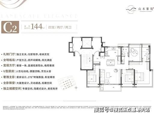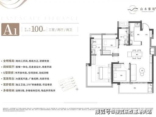 亮点:三开间朝南,南向面宽约 9.5 米;客餐连通阳台,全明通透;主卧套房带 270° 飘窗,U 型厨房搭配创新 S 墙,空间利用率拉满。