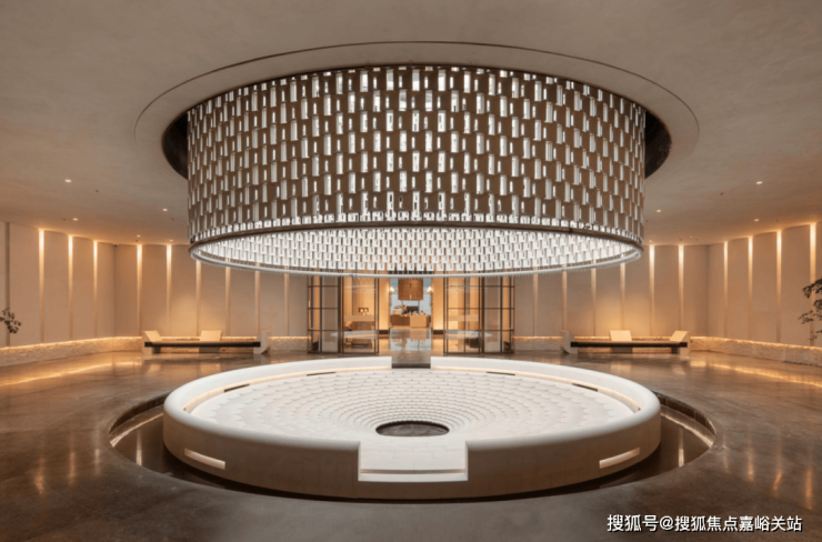 浮光池院水院会客厅,现已实景呈现,水景中央的艺术小品,如一滴水在湖面晕开,泛起阵阵涟漪。