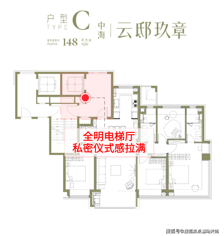 该户型外部呈 类一梯一户设计 ,将近10㎡的电梯厅空间成为家的延伸,配合门内玄关形成内外双玄关格局,大幅度提升了居家的私密性和仪式感。