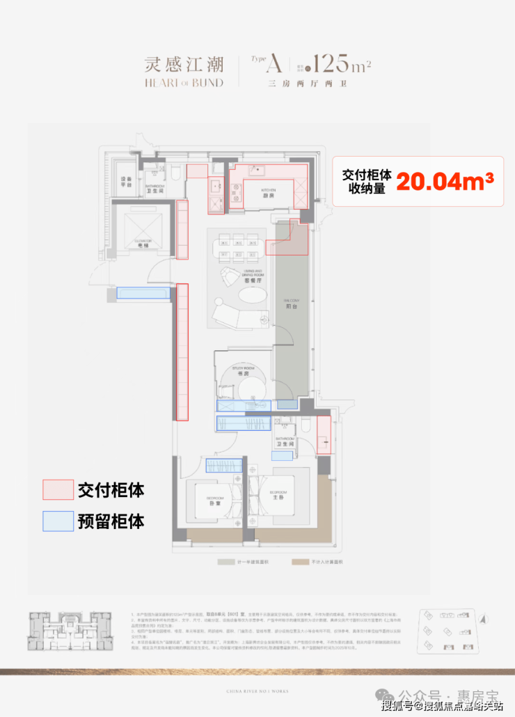 据统计,项目125㎡3房边套户型的整体交付柜子+预留衣柜, 收纳空间可以达到约20.04m³,中间套户型也能达到约16.56m³!