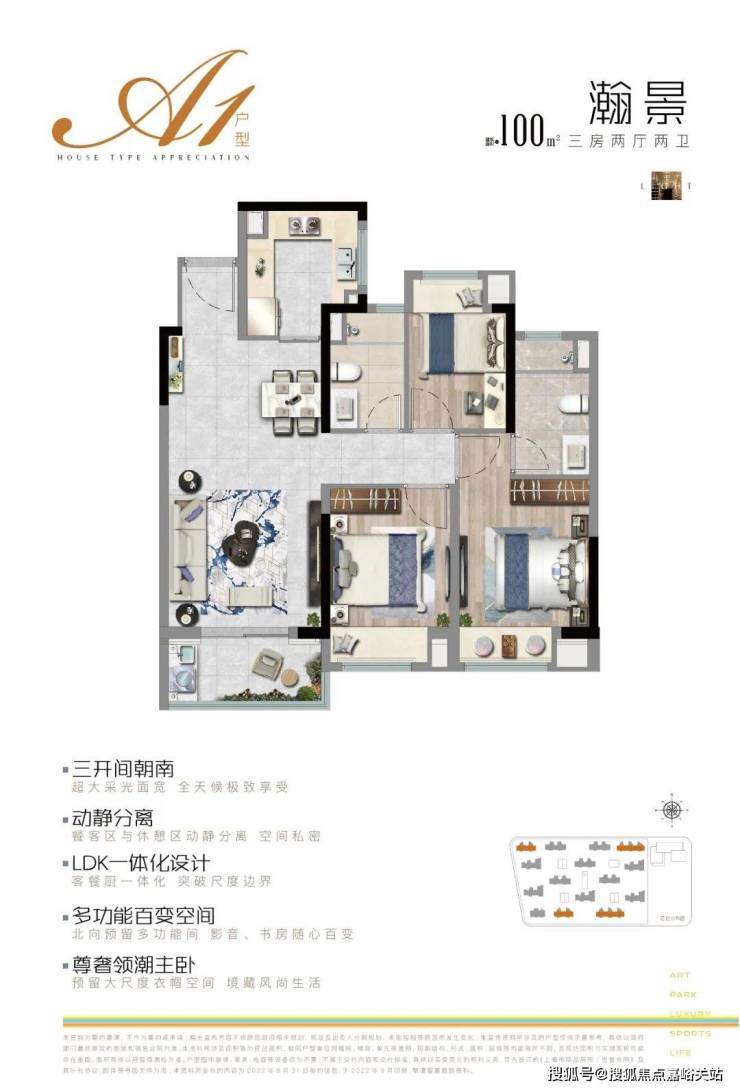 南北通透、主卧套房设计、干湿分离以及动静分离等等优质户型应该有的特质这个户型都具备。