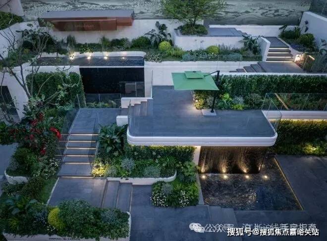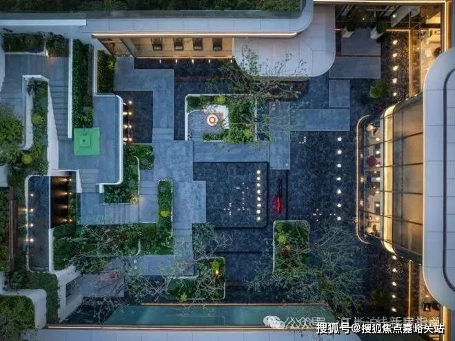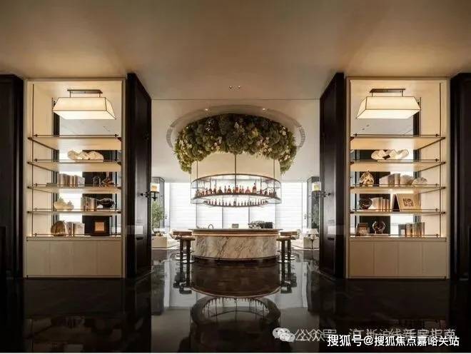 蓝翡翠水景围着下沉庭院,中间有蜿蜒的挑台连着瀑布,顶层还有供业主小聚的女王花厅,