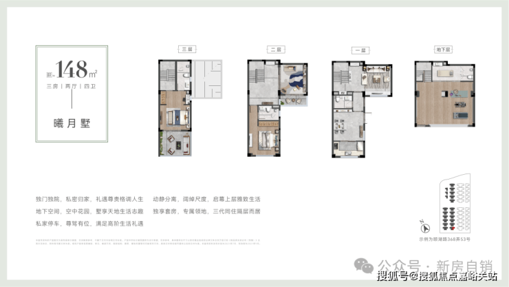 围合式合院,独立入户,三重院落有天有地有花园,人车分流,高窗墙比,窗窗见景,采光通风性佳