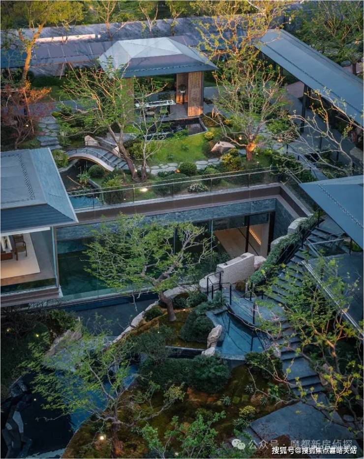 而最令人惊艳的,当属 约6米地势差打造的下沉式山水庭院 ,山、石、水、林有序交织,犹如一幅“豁然开朗”山水轴卷,每一步皆是景致,每一处皆有不同。